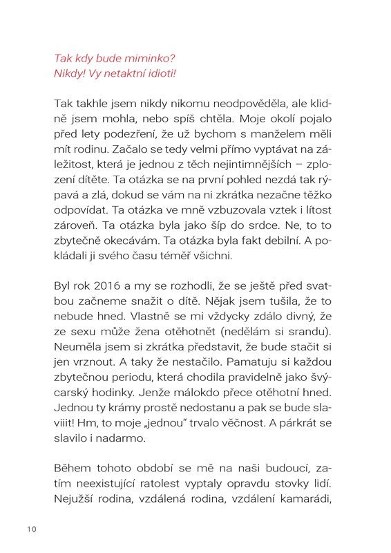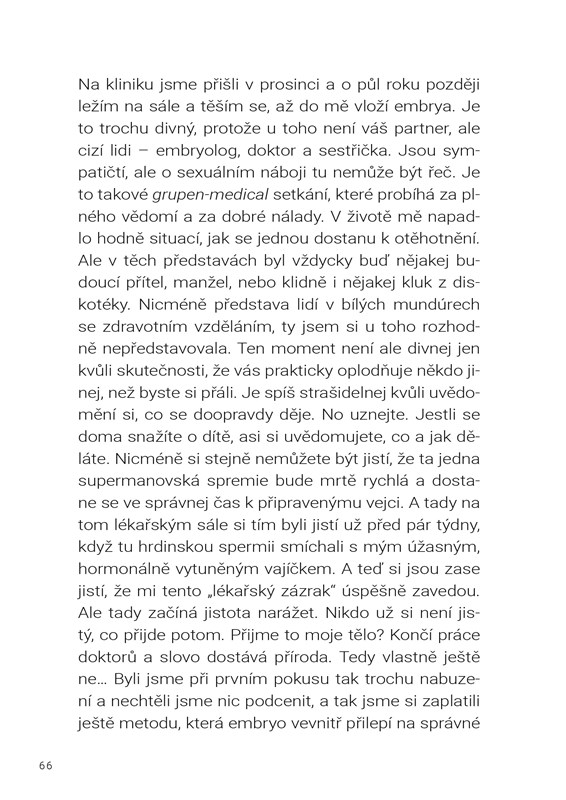To jako fakt nemůžu mít děti? Tak jsem se ptala sama sebe někdy kolem roku 2016. Mám si počítat plodný dny? Máme jít na reprodukční kliniku? Mám poslat svýho muže na vyšetření spermatu? Tohle všechno se mi honilo hlavou. A teď se to po těch letech honí knihou.