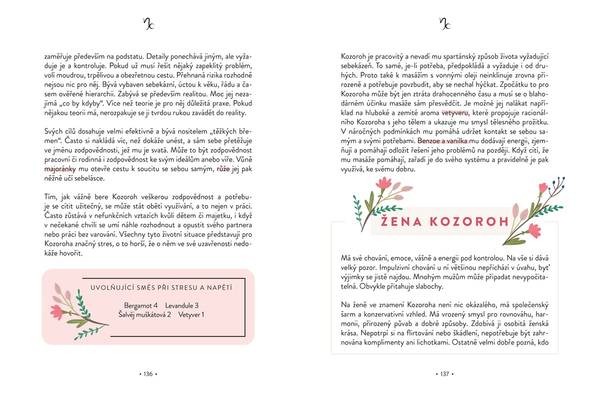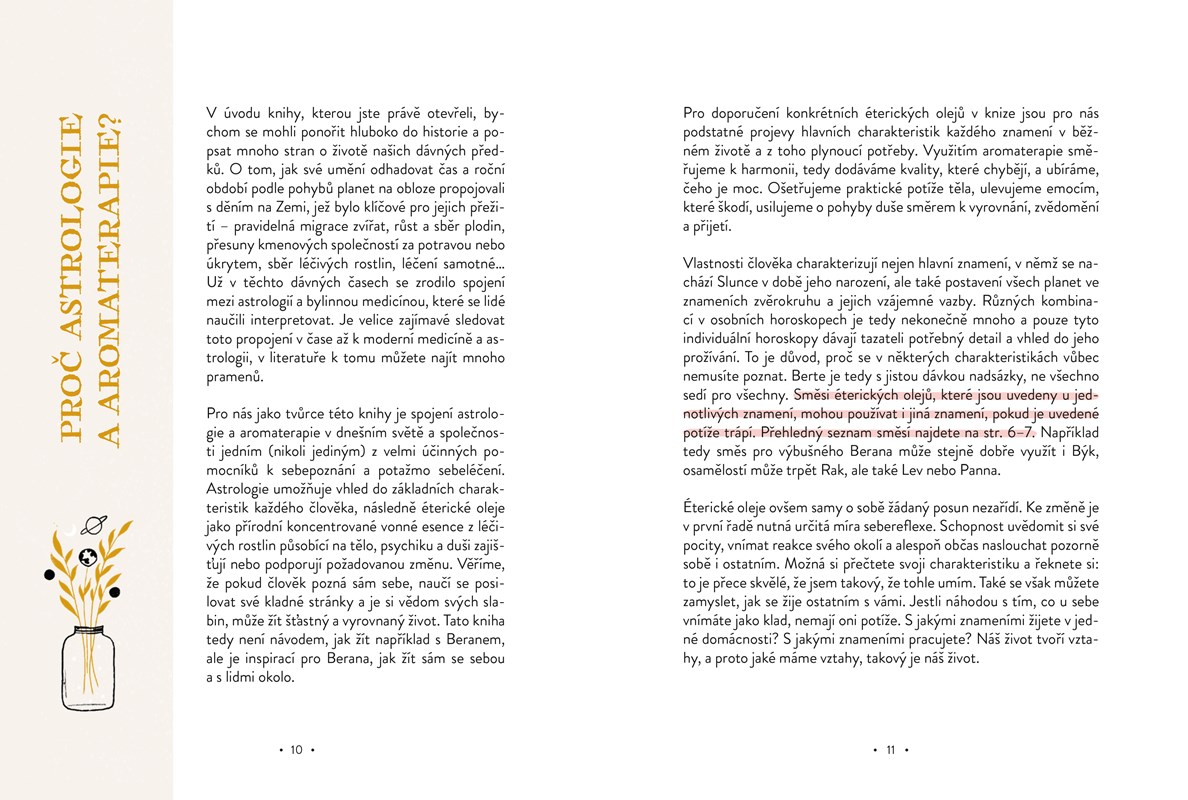 Jak funguje propojení aromaterapie s astrologií? V této knížce zjistíte, že se tyto dva obory mohou navzájem skvěle doplňovat. Najdete zde recepty na aromaterapeutické směsi a tipy na éterické oleje přímo na míru jednotlivým znamením. Charakteristický olej vám pomůže vyladit se do síly svého znamení a využít tak potenciál, který je vašemu znamení dán do vínku. Recepty na směsi pro konkrétní obtíže jsou vytvořené pro každé znamení podle jeho typické povahy a potíží, zároveň jsou však široce využitelné pro každého, kdo uvedenými potížemi trpí. A tak v knize najdete například zklidňující inhalace pro výbušného Berana, směs pro Býky na uvolnění a rozmluvení, éterické oleje pro přetížené Blížence a mnoho dalších.