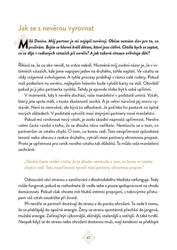 „Ani by mě nenapadlo, že po třiceti letech manželství, kde panoval chlad a odcizení, se můžeme milovat ještě víc než na začátku! Že naše sexualita bude tak živá a mnohem krásnější!“ Jsem nesmírně vděčná za to, že taková slova slýchám a čtu v mnoha různých obměnách od párů všech generací. Od párů, nad kterými psychologové a sexuologové zlomili hůl a radili jim, ať jdou raději od sebe. Od párů, které už neviděly jiné východisko, než rozvod…, ale láska jim nedala, aby nevyzkoušeli „ještě něco“.