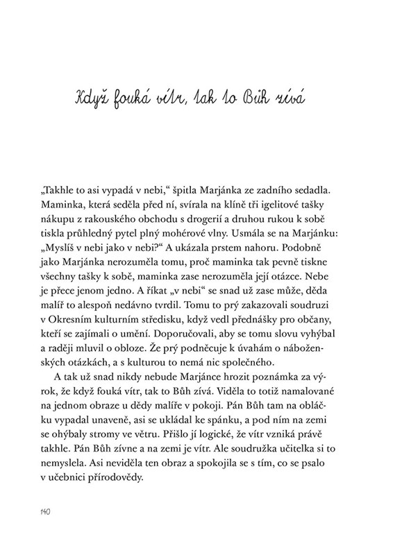 Její hrdinka Marjánka, žákyně základní školy v jihomoravské vesnici na dohled od rakouských hranic, komentuje události svého dětského i rodinného života před, během i po listopadu 89 s úžasnou barvitostí, konkrétností, jímavostí a zároveň s velkým smyslem pro humor.“